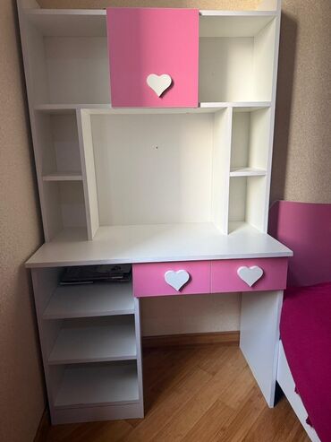 • Yazı masasının komplekti – üst rəfli-bibliotekalı konstruksiya, çoxsaylı açıq bölmələr, bir ədəd qapalı bölmə (çəhrayı qapı, ürək tutacaq), iki ədəd çekmece (çəhrayı önlüklər, ürək tutacaqlar), solda 3 mərtəbəli açıq rəf bloku.