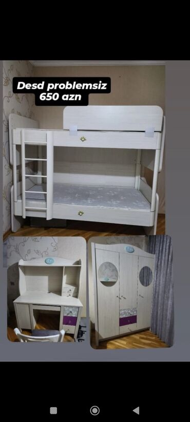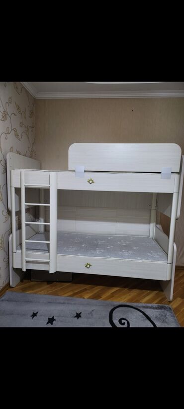 - İki mərtəbəli çarpayı: ağ rəngdə, yuxarı mərtəbə üçün təhlükəsizlik qoruyucusu, ön tərəfdə sabit nərdivan, hər iki mərtəbə üçün ortopedik döşək yerləri. Ön panellərdə dekorativ çiçək nişanı.
