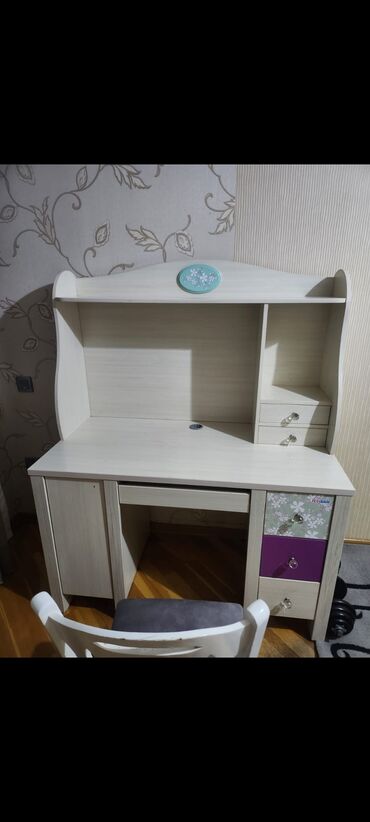 - İş masası: üstü rəfli və kabel keçidi üçün dəlik, sağ tərəfdə 4 çekmece (biri bənövşəyi, biri naxışlı dekorla), sol tərəfdə qapalı bölmə; üst paneldə dekorativ nişan.