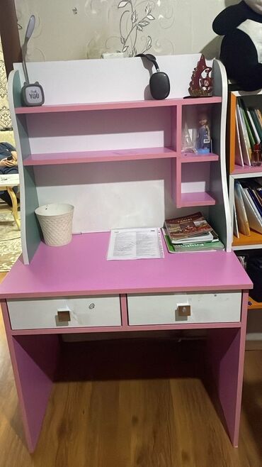 - İş masası: Çəhrayı-ağ rəngdə, yuxarı hissədə kitab və aksesuarlar üçün iki geniş rəf və əlavə bölmələr. Aşağı hissədə iki çekmeceli masa üstü. Dərs, rəsm və əl işləri üçün geniş iş səthi.