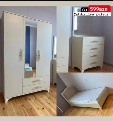 Yataq otağı dəsti – 3 rəng variantı (ağ, bej, qara-bəyaz). Üst yazı: 650 AZN. Endirim yalnız 3 gün. Dəst tərkibi: - 3 qapılı şkaf (orta hissədə güzgü) - Tualet masası güzgü ilə - 3 çekmecəli komod...