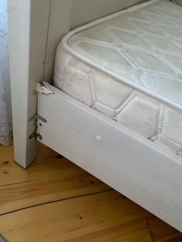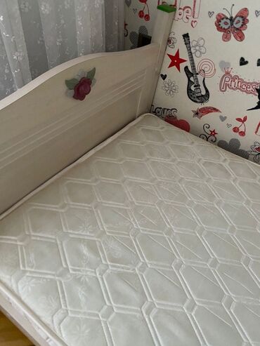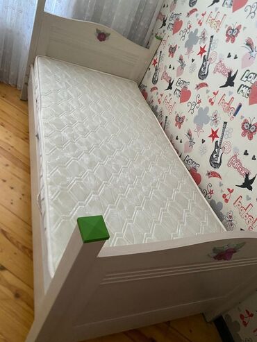 3) Tək nəfərlik çarpayı – başlıq və ayaqlıqda eyni dekor, lamel əsaslı. Üstündə uyğun ölçülü döşək.