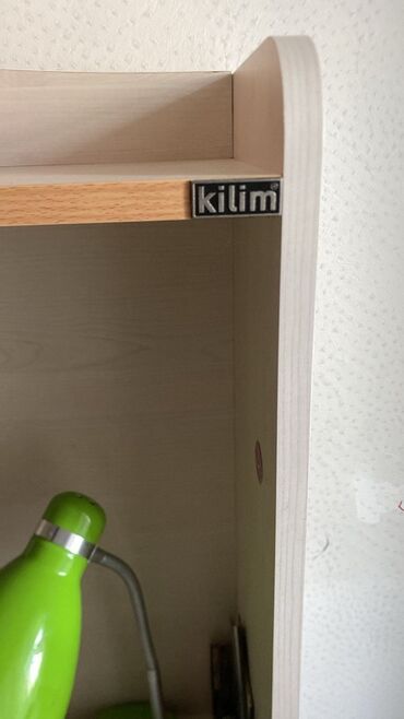 2) İş masası – geniş stolüstü, klaviatura üçün çıxarılan rəf. Sol tərəfdə 3 çekmece, sağda qapalı bölmə. Üstdə rəfli nadstroyka və qapaqlı kiçik şkaf.