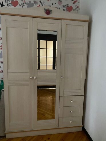 1) Geyim dolabı – 3 bölməli, ortada tam uzun aynalı qapı. Sağ tərəfdə ayrıca şkaf bölməsi və 3 ədəd çekmece. Daxildə asılqan və rəf yerləri.