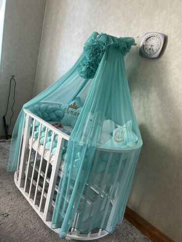 - Turkuaz tull və baldaxin: tavan dayağı və iri güllü bəzəklə, beşiyi tam örtən yüngül örtük.