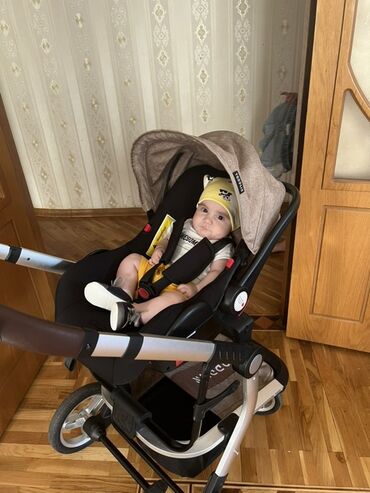 - Uşaq arabası: möhkəm şassi, iri təkərlər, tək əlli itələmə sapı; avtomobil oturacağı tipli daşıma beşiyi şassiyə qoşulur, günlüklə və 5 nöqtəli kəmərlə.
