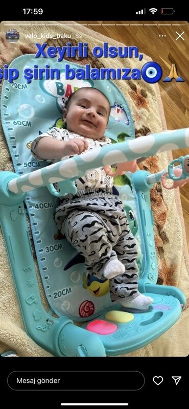 - Körpə üçün inkişaf xalçası/oyun mərkəzi: turkuaz rəng, ölçü göstəricili döşəmə (20–60 sm işarələri), üst hissədə asılqanlı oyuncaq barı, altda işıqlı musiqi düymələri.