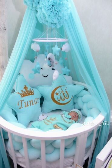 - Beşik içi tekstil: turkuaz toxunma bortik (hörük tipli), ağ çarşaf, dekorativ yastıqlar – bulud və ulduz formalı, ulduzun üzərində qızılı naxış.