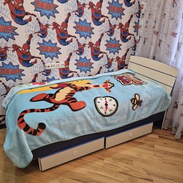- Tək nəfərlik uşaq çarpayısı: ağ/ göy rəng çalarları, zolaqlı başlıq, alt hissədə 2 ədəd çekmece (sağ və solda dairəvi qulplu), yeraltı saxlama üçün geniş bölmələr.