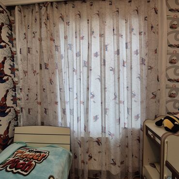 - Pərdə və tül dəsti: ağ şəffaf tül üzərində qəhrəman və hörümçək toru motivləri, tavandan karnizə keçən tam ölçülü.
