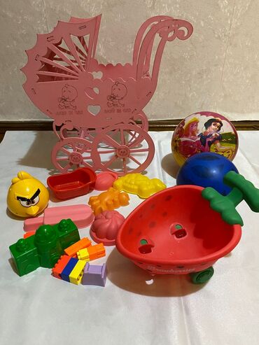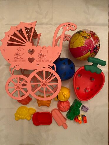 Uşaq oyuncaqları paketi - Plastik topçuq dəsti: təxminən 335 ədəd rəngbərəng toplar. Üstündə göstərilən qiymət: 20 man. - Uşaq boulinqi: 10 rəngli fiqur (kegl) və 1 top. Üstündə göstərilən qiymət:...