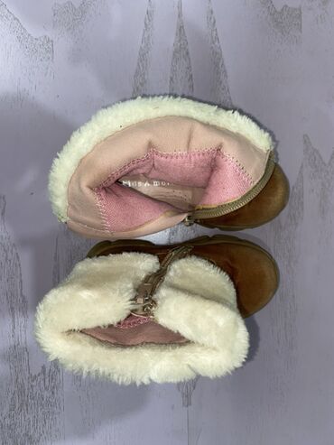 Uşaq qızlar üçün qış çəkmələri – açıq çəhrayı rəngdə, parıltılı üst materialla. İç hissə yumşaq, isti süni kürklə örtülüb. 22 razmer