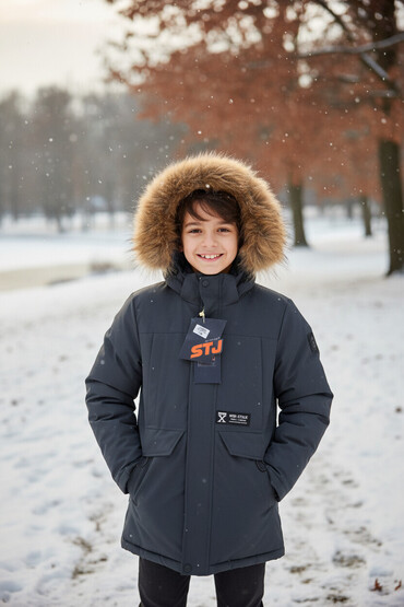 Uşaq üçün qış parkası - Rəng: tünd göy/qaraya yaxın - Model: kapüşonlu, süni kürk astarlı kapüşon - Ön hissə: fermuarlı bağlama və düyməli üst qapaq - İsti, qalın şişmə dizayn - Bel hissəsində tən...