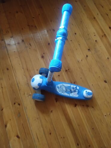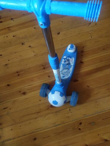Mavi rəngli uşaq skuteri. Bu modeldə üç təkər var, bu da onu dayanıqlı edir və yeni başlayanlar üçün uyğundur. Skuterin ön hissəsində futbol topu şəklində bəzək elementi və təkərlərində işıqlar var. Qolu tənzimlənən hündürlüyə malikdir, bu da onu uşağın böyüməsinə uyğunlaşdırmağa imkan verir. Uşaqlar üçün əyləncəli və təhlükəsiz bir gəzinti üçün nəzərdə tutulmuşdur.