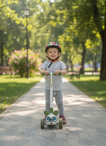 Skuter satılır. Ön tərəfində eynəkli bir cizgi film personajının başı dizaynı var,Sükanın hündürlüyü tənzimlənə bilir, bu da uşağın boyuna uyğunlaşdırmağa imkan verir.həm də sükanı rahatlıqla yığı...