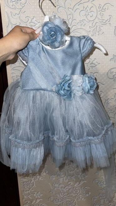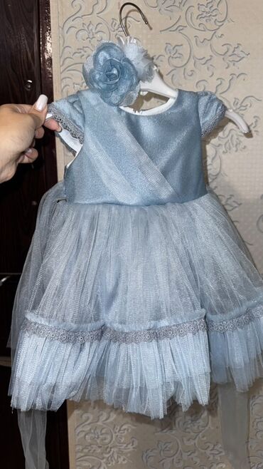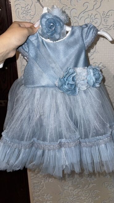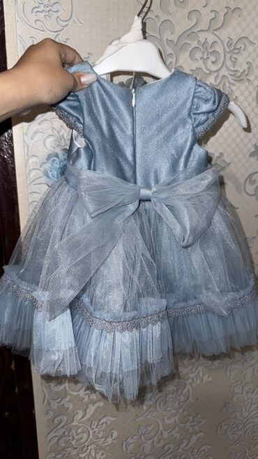 Uşaq/gecəlik ziyafət paltarı – açıq mavi rəngdə. 1defe de geyinilmeyib,cox gozel - Model: yuxarı hissəsi krujeva (naxışlı) parçadan, aşağı hissəsi çoxqatlı şifon/orqanza ətək - Üst hissədə daş və ...