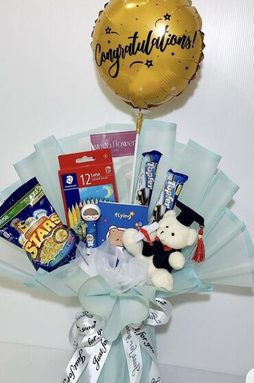 - Aksessuarlar: “Congratulations!” yazılı qızılı şar, məzun papaqlı oyuncağ ayı, hədiyyə qutucuqları