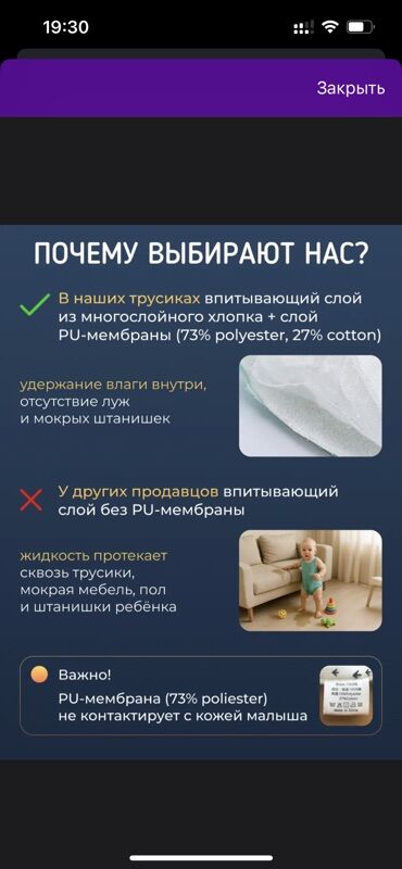 - Полиуретановая мембрана удерживает влагу, предотвращает образование луж и мокрых трусиков; мембрана не контактирует с кожей малыша.