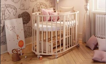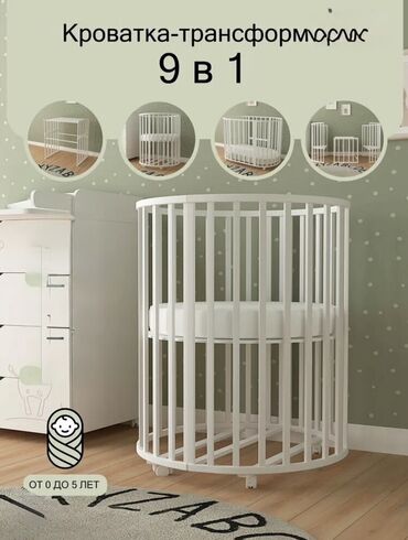 - 0–5 yaş üçün uyğun funksional model (şəkildə: “Кроватка‑трансформер 9 в 1”, “от 0 до 5 лет”).