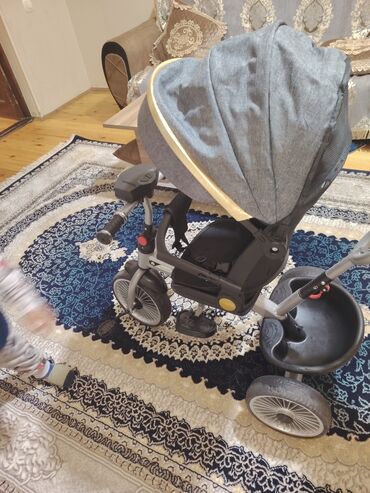 - 2-si 1-də: valideyn idarəedici tutacağı və böyük günəşlikli kölgəliklə gəzinti arabası kimi, pedallar və sükanla uşaq velosipedi kimi istifadə oluna bilir.