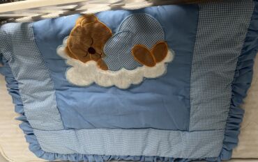 Uşaq kravatı üçün dekor balışları:2ədəd ulduz(ququşu əvəzinə),1ədəd bulud və 1ədəd hörük; asılqan; musiqili oyun xalçası; konvert bələk -hamısı çox təmiz,səliqəli və az işlənmişdir -115azn dəst hal...