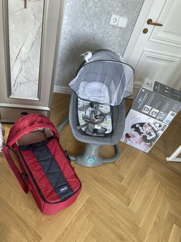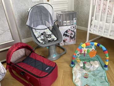 - Elektrik beşik/şaqqıltı kreslosu: Şəbəkəyə qoşulan yelləncəklə beşik funksiyalı oturacaq. 3‑ü 1‑də tipli model (qutusu var). Yumşaq oturacaq, beşpunktlu təhlükəsizlik kəməri, başaltı yastıq, ağcaqanad toru. Alt hissədə idarəetmə paneli ilə müxtəlif yellənmə rejimləri və musiqi/səslər. Yanında çıxarılan oyuncaqlı asılqan.
