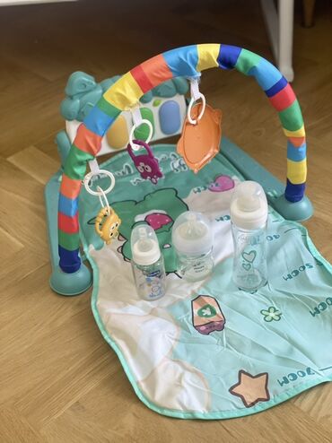 - Rəngarəng inkişaf xalçası: Qövs formalı asılqan, asılan çıngırlaqlar və diş qaşıyıcı oyuncaqlar, arxada ayaqla basılan piano klaviaturası. Yumşaq yuyula bilən xalça.