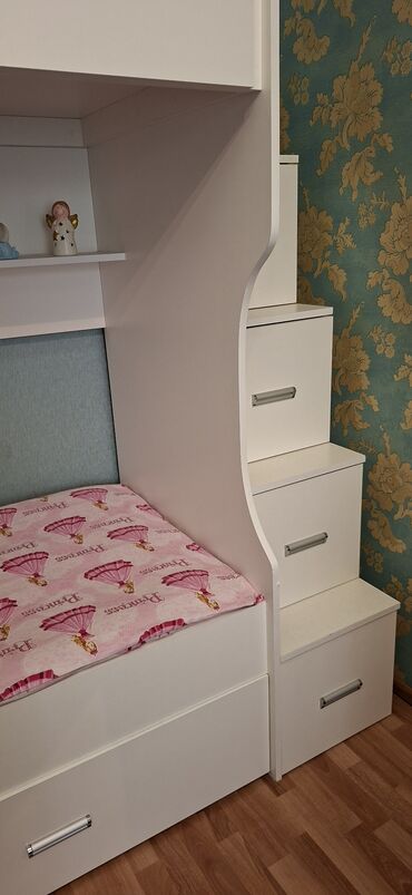 - Ölçü təsviri: tək ölçülü döşək üçün (standart uşaq ölçüsü); konstruksiya eninə uzun rəf zonası ilə kompakt divar modulu kimi