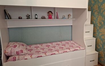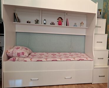 Funksional saxlama, rahat yatma və kitab/oyuncaq üçün vitrini birləşdirən praktik mebel dəsti.