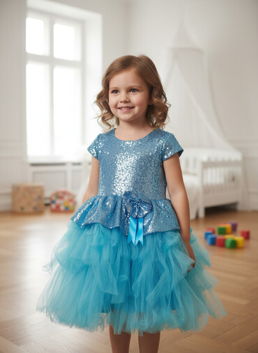 Mavi rəngli zərif qız uşaq paltarı - Material: şifon/tül üst qat, nazik astar - Dizayn: sinə hissəsində ağ krujeva aplikasiyalar və zolaqlı dekor, dairəvi yaxa - Qol: 1/2 uzunluqda şifon qollar, u...