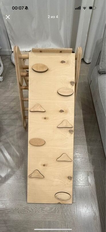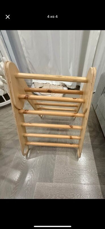 - Montessori üslubunda taxta dırmaşma üçbucağı. Yan panellər çoxqatlı kontrplakdan, pillələr isə dairəvi taxta çubuqlardan hazırlanıb.