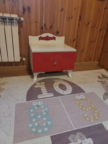 - Komodin: bir geniş çekmece, üstü dekorlu başlıq, şəffaf tutacaq, ağ-qırmızı rəng.
