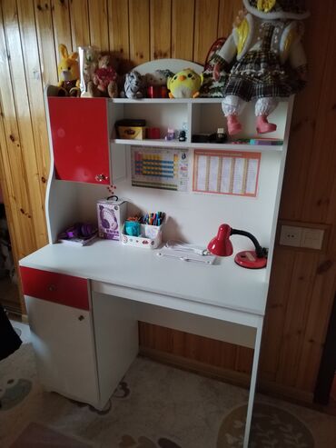- Yazı/iş masası: üst hissədə açıq rəflər və kiçik qapalı bölmə, aşağıda geniş iş səthi, solda qapılı dolab və çekmece. Ağ-qırmızı rəngdə, yuvarlaq künclü təhlükəsiz dizayn.