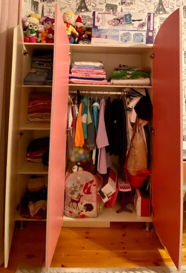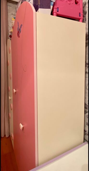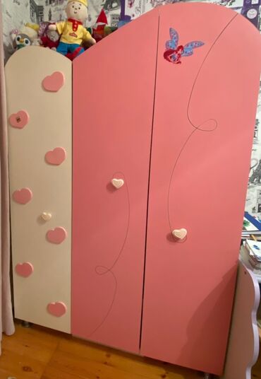 - İki qapılı şkaf: çəhrayı-krem korpus, bir tərəfi qapı, digər tərəfi çekmece/yuvarlaq dekor düymələri; ürək formalı tutacaqlar və naxışlı ön panel.