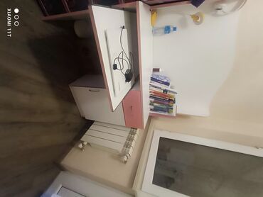 - Yazı masası: geniş iş səthi, sağda çekmece, solda qapılı şkaf, üst hissədə divara bərkidilən ağ-çəhrayı rəf paneli (kitab və aksesuarlar üçün).