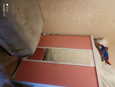 - Üç qapılı şkaf: iki dolab bölməsi + ortada boy güzgüsü. Yuxarıda geniş rəf, içəridə asılqan və rəflər.