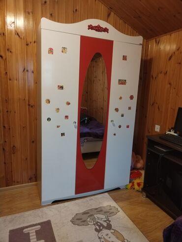- Şkaf: ikitürlü, ön hissədə iri oval güzgü, içəridə asılqan və rəflər üçün geniş sahə. Ön panellərdə bəzək stikerləri.