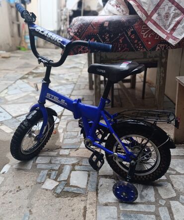Uşaq velosipedi – STELS - Rəng: mavi - Təkərlər: təxminən 16" diametrli, qalın dişli şinlər - Əyləc: ön çarxda mexaniki V-brake, arxa təkərdə ayaq (torpedo) əyləci - Çərçivə: polad, aşağı enişli, ...