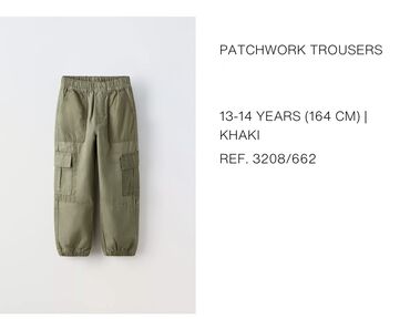 13-14 yaş (164 sm) uşaqlar üçün xaki rəngli patchwork kargo şalvar. Elastik belli və biləkləri manşetli bu şalvar rahat geyim üçün nəzərdə tutulmuşdur. Yanlarda və bud hissəsində böyük qapaqlı cibləri var. Müxtəlif çalarlı parça panellərindən tikilmiş dizaynı ona unikal görünüş verir. Gündəlik istifadə üçün uyğundur.