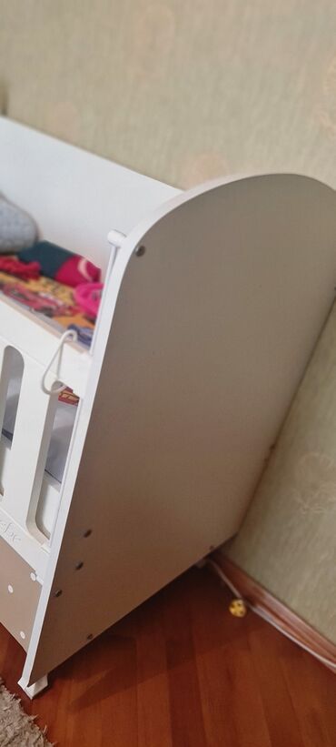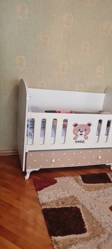 Uşaq beşiyi – transformasiya olunan model - Material: möhkəm MDF/laminat kombinasiyası, kənarlarda yuvarlaq təhlükəsizlik profilləri. - Rəng: krem və qəhvəyi tonların harmoniyası. - Sürüşən ön bar...