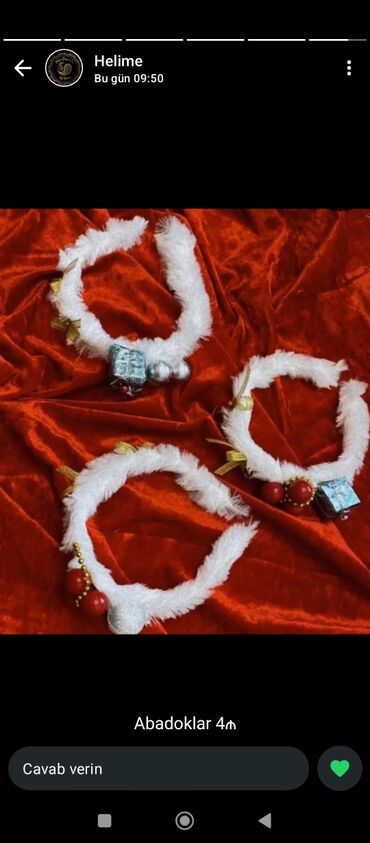 - Qırmızı məxmərdən Yeni il don dəsti: ağ süni tük bəzəkli, uzunqollu, ətək hissəsi fırfırlı. Dəstdə uyğun saç lenti/başlıqlı saç bağı və bəzəkli kəmər-qurdelə var. Şənlik, fotosessiya və məktəb tədbirləri üçün uyğundur.