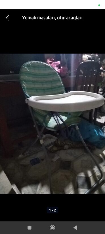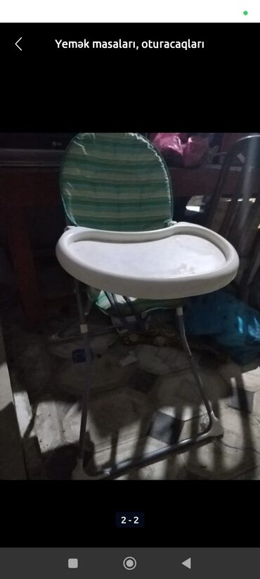 Uşaq yemək stulu - Yüksək oturacaq, qatlanan metal karkas - Yumşaq, naxışlı parça oturacaq və bel dəstəyi - Önündə geniş, çıxarıla bilən plastik masa/tray – fincan üçün ayrıca yuva - Ayaqaltı mövc...