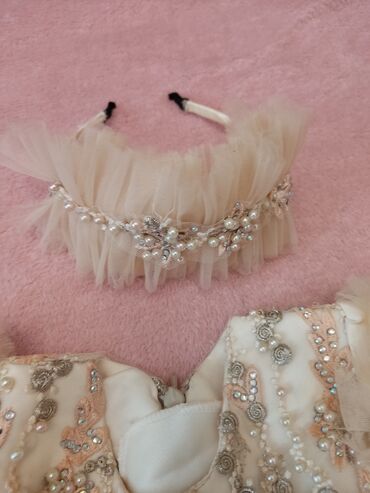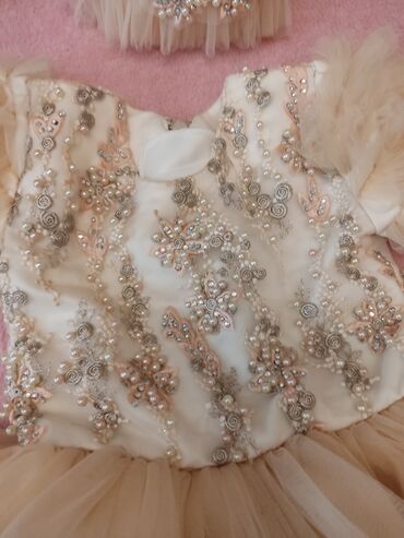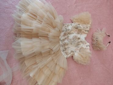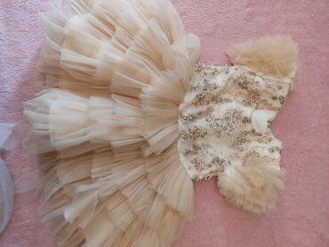 Qız uşağı üçün zərif ziyafət/gəlinlik paltar - Rəng: Şampan qızılı - Arxada iri tül bant - Bayram, ad günü, fotosessiya və mərasimlər üçün idealdır Bir dəfə geyinilib 1 yaşa uyğundu
