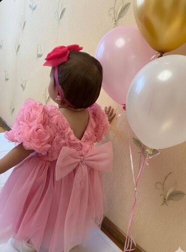 Zərif qız uşağı paltarı – açıq çəhrayı rəngdə, yubkası çoxqatlı tüllü dizayn. Geniş şar-şəkilli qollar, arxasında iri atlas bant və lent detalları. Yumşaq parça, bayram və fotosessiyalar üçün ideal...