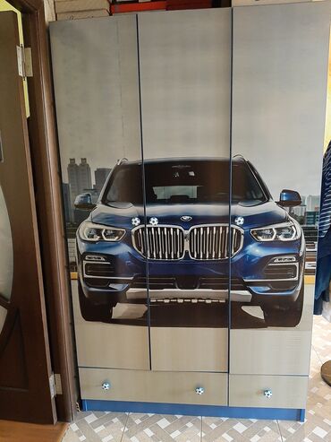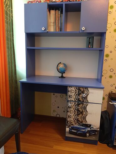 - Yazı masası üst dolabı ilə – geniş iş səthi, 2 bağlanan kiçik şkaf, açıq rəflər və sağda 2 qapılı bölmə; ön hissədə avtomobil printləri və futbol topu formalı saplar.