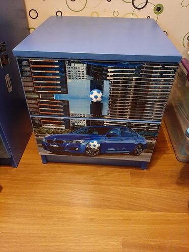 - Yataq otağı tumbi/komod – 2 çekmecəli, ön fasadda mavi avtomobil printi, futbol topu formalı saplar.