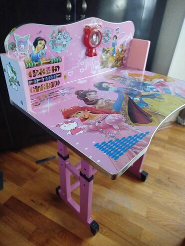 Uşaq üçün yazı və dərs masası - Rəng: çəhrayı - Üst hissə və arxa panel uşaq mövzulu naxışlarla bəzədilib (prenses illüstrasiyaları, rəqəmlər və şəkillər). - Arxa paneldə mexaniki hesablama çubuğu...