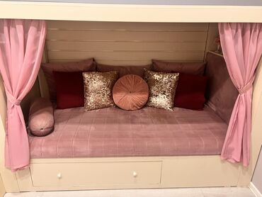 - Alt mərtəbə: niş şəklində rahat divan/yataq zonası, iki tərəfdən tül pərdələr və bağlama lentləri. Yumşaq oturacaq-yataq hissəsi, dekor yastıqlar ilə.