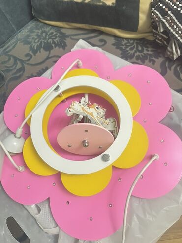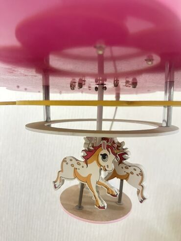 - Dizayn: Çiçək formalı korpus (çəhrayı-sarı) və mərkəzdə dairəvi element. Ortada fırlanan karusel motivi – balaca bəzəkli “unicorn” fiqurları ilə.