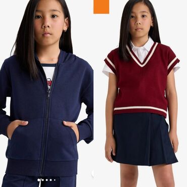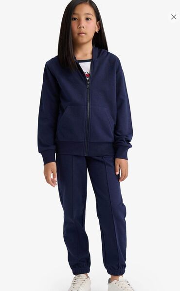 Uşaq üçün məktəb dəsti – tünd göy rəngdə svitşot tipli jaket və ətək. Xüsusiyyətlər: - Rəng: tünd göy, detallarda mavi və boz zolaqlar - Jaket: fermuarlı, yumşaq trikotaj/parça, boğaz və ətək hiss...